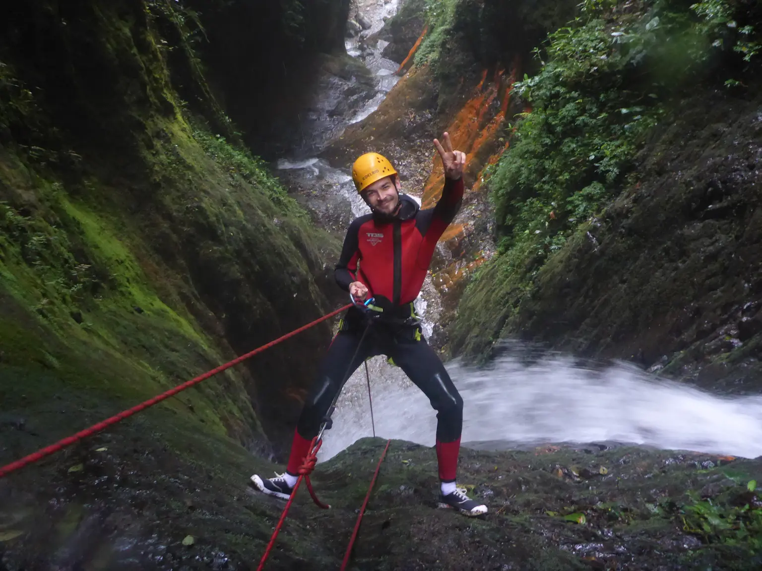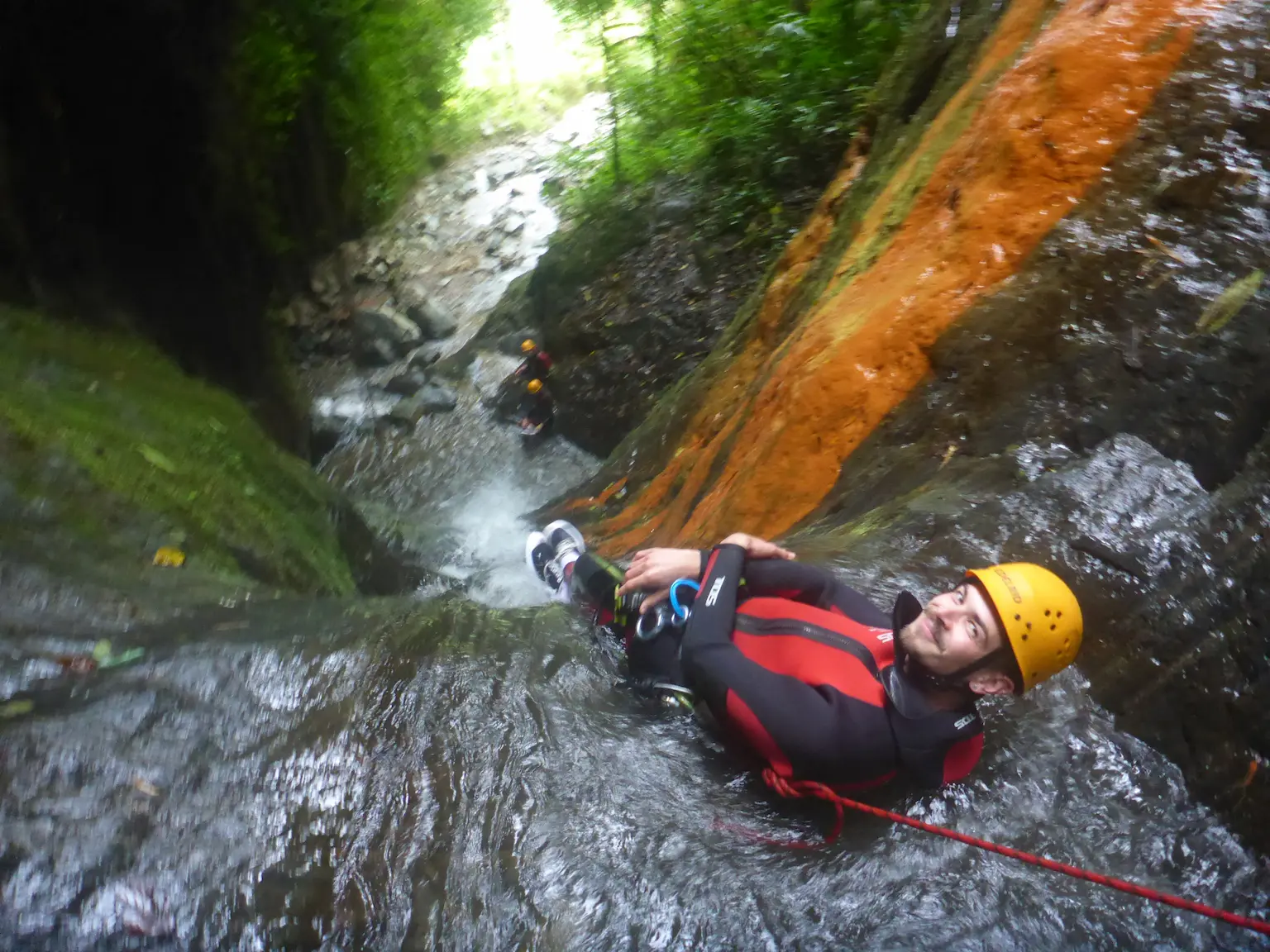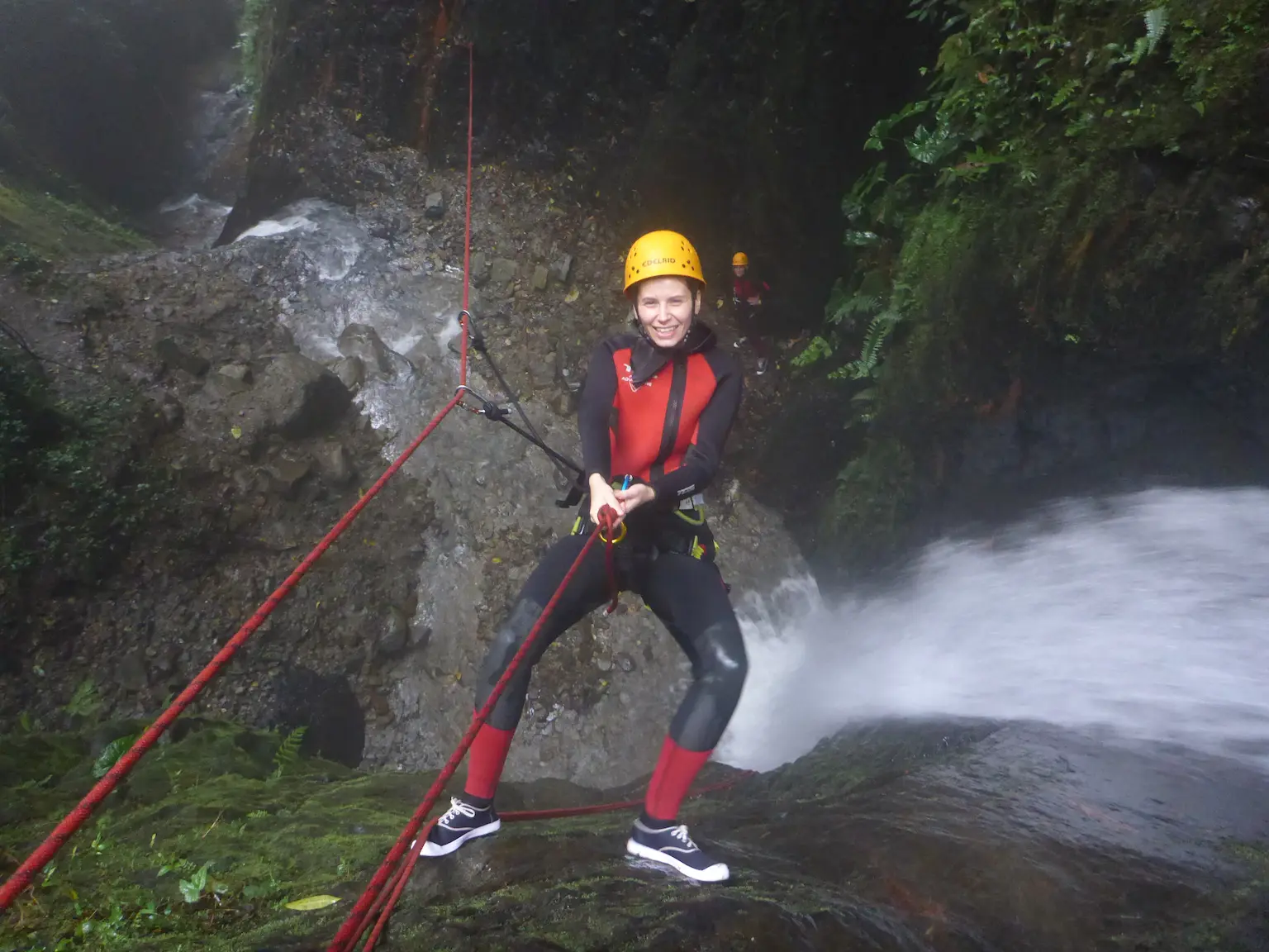 The main event! We descend a series of 5 stunning waterfalls ranging from 12m to 35m. This route offers variety: you will practice different rappelling styles, fly on a zip line, and slide down a natural water toboggan.