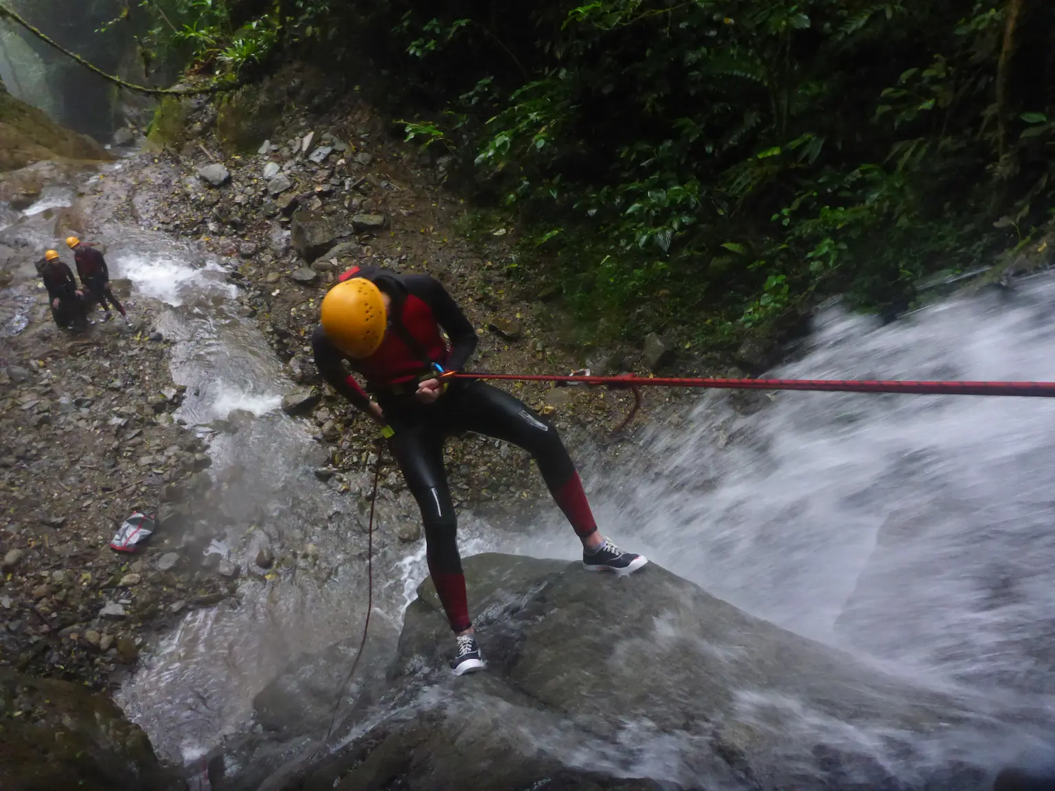 A 20-minute drive takes us to Río Blanco. On-site, we put on our gear and have a crucial safety briefing. Then, we warm up with a scenic 20-minute hike through the forest to reach the top of the canyon.